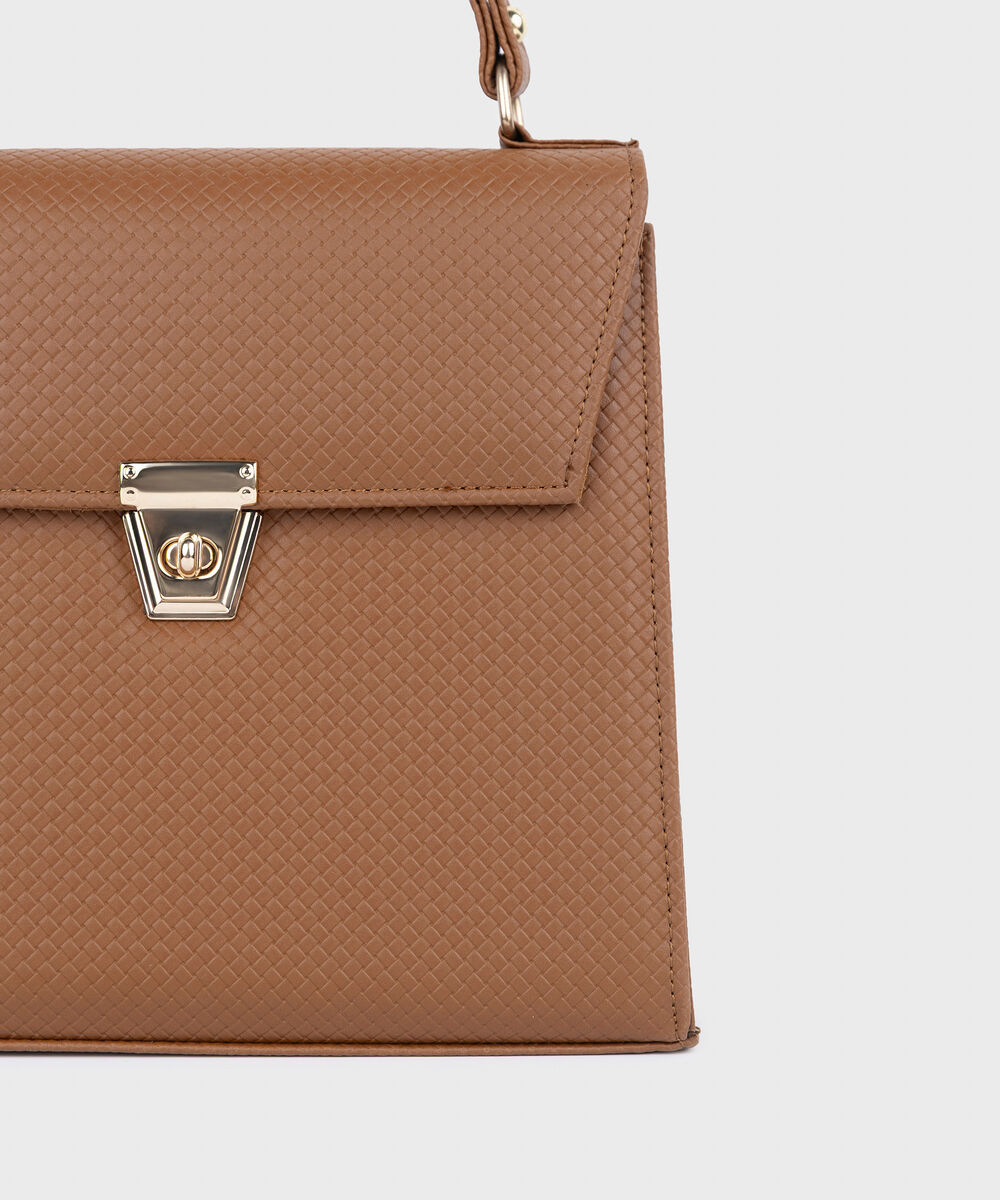Perfect your style with our textured tan top handle bag with a tuck lock closure.