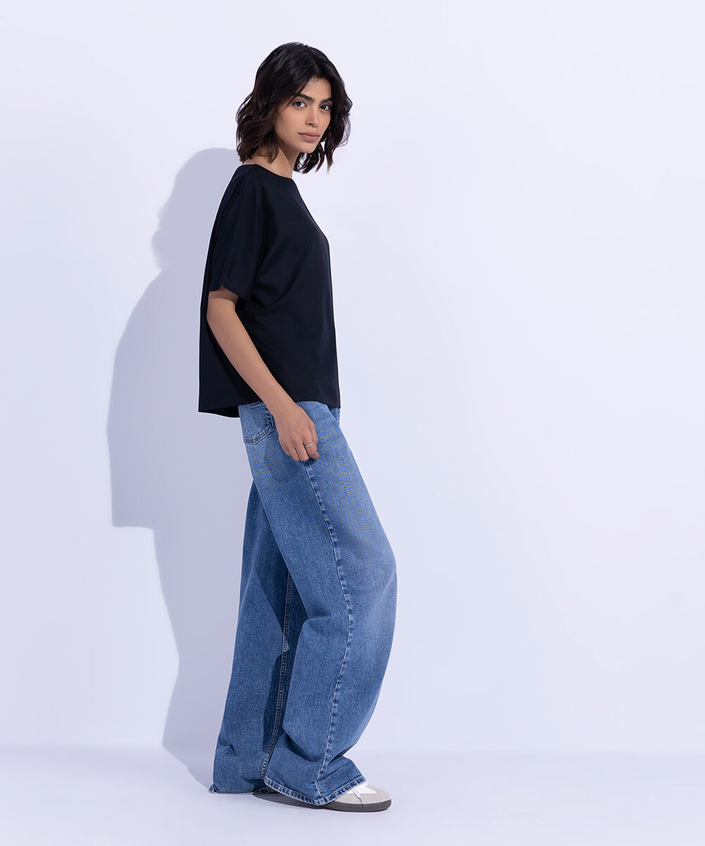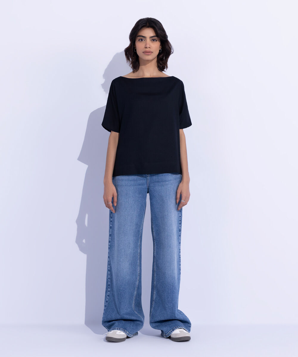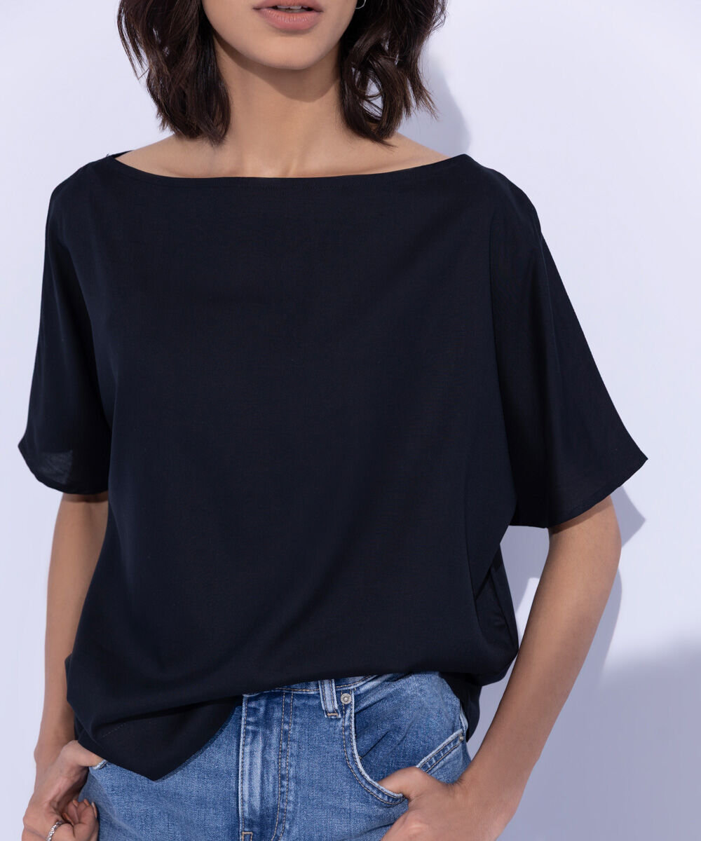 Slash neck top in soft drapey fabric. Slash neck with short kimono sleeves.